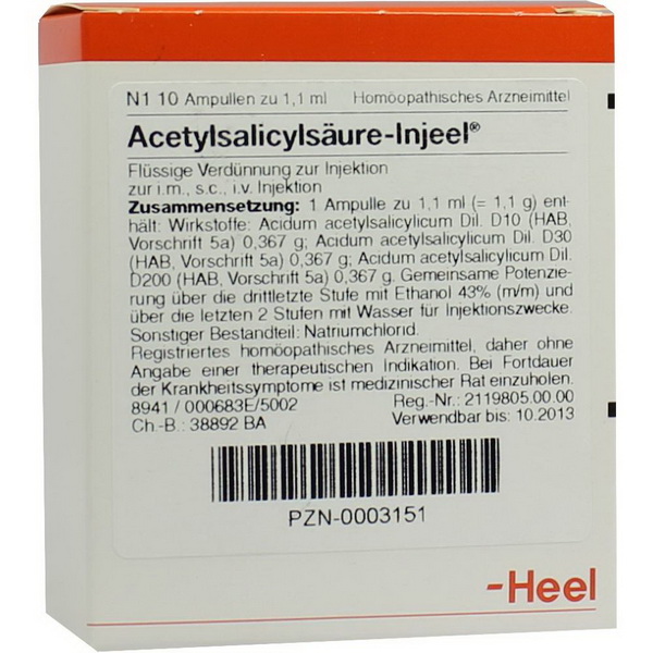 | Acidum acetylsalicylicum Dil. D10 [HAB, V. 5a; Lsg. D1 mit Ethanol 86% (m/m)] | 0,367 g |