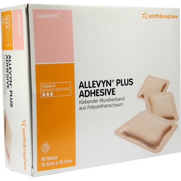 Haftender Wundverband aus Polyurethanschaum für die Versorgung von Wunden mit starker bis sehr starker Exsudation. Absorbiert bis zu 50% mehr als ALLEVYN ADHESIVE – steril.