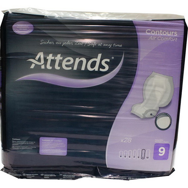 Attends Contours Air Comfort 9 (Saugstärke 9) sind anatomisch geformte Vorlagen. Für starke Urin- und Stuhlinkontinenz bei vollständigem Verlust der Kontrolle über Blasen- und Darmfunktion. Bei starken Urin- und Stuhlverlusten und für längere Tragezeiten.