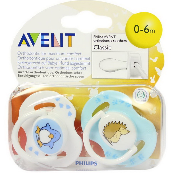 Die kiefergerecht geformten, weichen und symmetrischen Philips AVENT Sauger sorgen für eine natürliche Entwicklung von Gaumen, Zähnen und Zahnfleisch. Alle Philips AVENT Beruhigungssauger bestehen aus Silikon und sind geruchs- und geschmacksneutral. Änderungen der Farben vorbehalten.