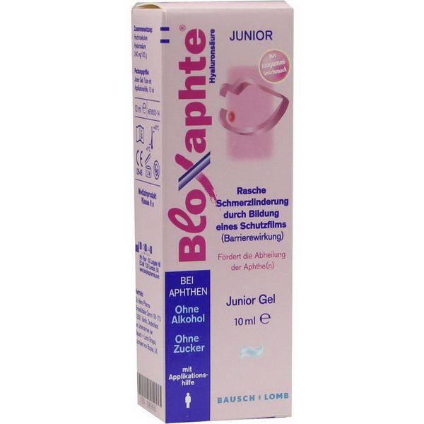 Das alkoholfreie BloXaphte Junior Gel mit Hyaluronsäure eignet sich zur gezielten Behandlung von Aphthen und entzündlichen Schleimhautverletzungen (Läsionen) und kann bei Kindern ab 30 Monaten angewendet werden. Das Gel lindert schnell den Schmerz durch die Bildung eines Schutzfilms (Barrierewirkung), fördert die Heilung der Aphthe(n) und brennt nicht bei der Anwendung. BloXaphte Junior Gel ist zuckerfrei und sanft zur Mundflora (gleicher ph-Wert wie Speichel). Der Kaugummi-Geschmack und die lange Kanülenspitze der Tube vereinfacht die Anwendung bei Kindern. Nach Anbruch 12 Monate verwendbar.