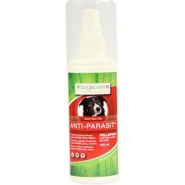 bogacare®ANTI-PARASIT Fellspray gegen ZECKEN, Flöhe und Milben ist eine Flüssigkeit zum Aufsprühen aufs Fell. Das Spray basiert auf unserer bewährten Kombination von Margosa-Extrakt und Zitronen-Eukalyptusöl. bogacare®ANTI-PARASIT Fellspray ist auch praktisch für unterwegs und bietet einen Schutz von mehreren Stunden.