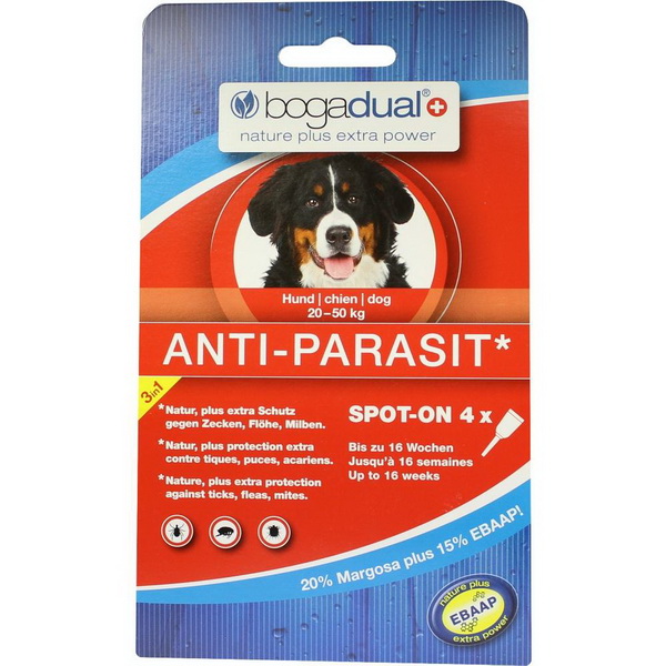 bogadual®ANTI-PARASIT Spot-on ist die erste Spot-On Lösung von Bogar mit dem neuartigen, wissenschaftlich getesteten Dual-Prinzip. Dabei wurde der hochdosierte pflanzliche Wirkstoff Margosa mit einem synthetischen Wirkungsverstärker ergänzt und optimiert. Dank seiner repellierenden Eigenschaft auf Zecken, Flöhe und Milben ist Margosa hervorragend zur Parasiten-Prophylaxe bei Hunden geeignet.