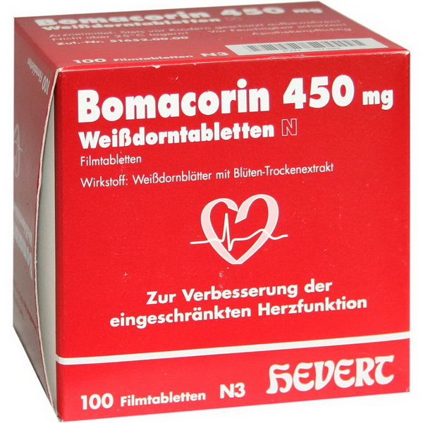Voraussetzung für eine erfolgreiche Behandlung mit Bomacorin 450 mg Weißdorntabletten N ist die regelmäßige, tägliche Einnahme. Eine unregelmäßige Einnahme gefährdet den Behandlungserfolg. Zur Pflege des biologisch alternden Herzens und zur Dauertherapie sind Bomacorin 450 Weißdorntabletten N besonders geeignet.