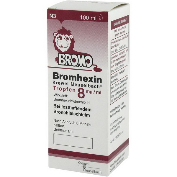 Bromhexin Krewel Meuselbach® Tropfen 8 mg/ml sind ein Bronchosekretolytikum (Arzneimittel zur Schleimlösung bei Atemwegserkrankungen mit zähem Schleim). Bromhexin Krewel Meuselbach
