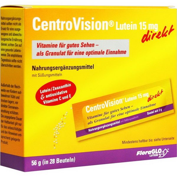 CentroVision ® Lutein 15 mg direkt ist ein Nahrungsergänzungsmittel mit antioxidativen, sogenannten Radikalfänger -Eigenschaften. Es enthält eine V italstoffkombination aus den V itaminen C, E und Niacin (B3), den Spurenelementen Zink, Kupfer und Selen sowie den natürlichen Carotinoiden Lutein und Zeaxanthin.