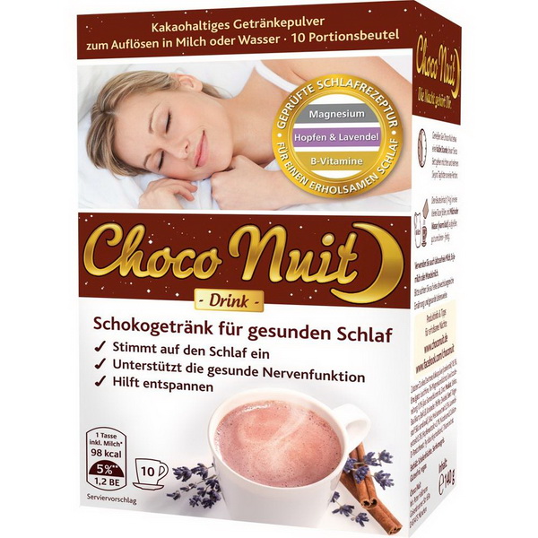 Choco Nuit Drink ist das leckere Schokogetränk für eine gute Nacht. Seine besondere Nachtrezeptur verbessert das Wohlbefinden, stimmt auf die Nacht ein und enthält wertvolle Nährstoffe* für gesunde Nerven und Psyche. Choco Nuit Drink ist kein Arzneimittel, sondern ein Lebensmittel mit natürlichen Zutaten und bewirkt keine Gewöhnungs-effekte.