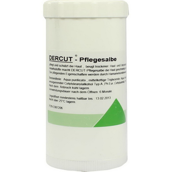 Pflegt und schützt die Haut, beugt trockener Haut und Entzündungen vor. Durch seine hautpflegenden Inhaltsstoffe macht DERCUT Pflegesalbe die Haut geschmeidig und schützt sie vor äußeren Einflüssen. Die pflegenden Eigenschaften werden durch Hamamelisrindenwasser unterstützt.