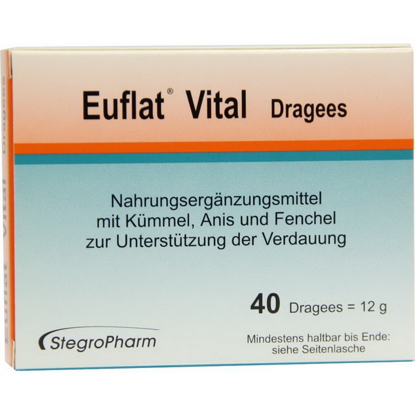 Nahrungsergänzungsmittel zur Unterstützung der Verdauung. Die in Euflat Vital Dragees enthaltenen Pflanzenstoffe können einen wichtigen Beitrag zur Verdauungsförderung leisten und helfen bei der Verarbeitung schwer verdaulicher oder blähungsfördernder Lebensmittel.