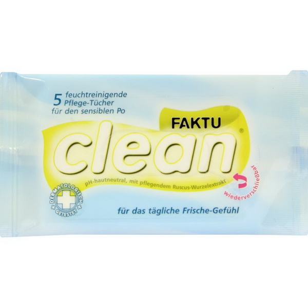 Wärme, langes Sitzen und enge Kleidung führen mitunter zu unangenehmen Hautreizungen, diese werden oft auch einfach nur sensibler Po genannt. Nun reagiert die Haut schon auf kleinste Reizungen und Irritationen sehr empfindlich, sie schmerzt erheblich. Jetzt können Ihnen die feuchten Pflegetücher von Faktuclean Erleichterung verschaffen, sie sorgen für ein schnelles Abklingen und Beruhigung der gereizten Haut. Diese Pflegetücher enthalten Extrakte der Ruscuswurzel, diese wirken beruhigend und pflegend. Zudem sind die Feuchttücher parfümfrei, hautschonend und pH-neutral. Darüber hinaus enthalten sie aber auch keine Farbstoffe oder Alkohol. Sie eignen sich somit hervorragend zur pflegenden, sanften Nachreinigung des Analbereiches sowohl Zuhause als auch für unterwegs.