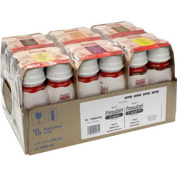 Der Mischkarton enthält 3 Varianten (Vanille, Waldfrucht, Aprikose-Pfirsich) Fresubin® 2 kcal DRINK (ballaststofffrei) und 3 Varianten (Schokolade, Cappuccino, Lemon) Fresubin® 2 kcal fibre DRINK (ballaststoffreich).