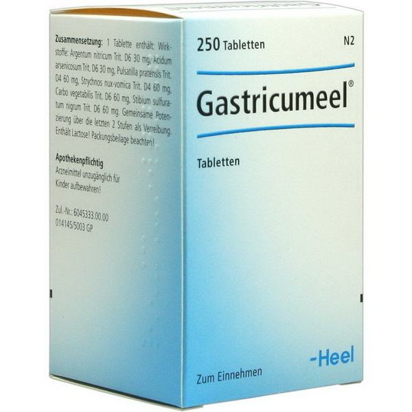 Arzneilich wirksame Bestandteile: Argentum nitricum Trit. D6, Acidum arsenicosum Trit. D6 jeweils 30 mg; Pulsatilla pratensis Trit. D4, Strychnos nux-vomica Trit. D4, Carbo vegetabilis Trit. D6, Stibium sulfuratum nigrum Trit. D6 jeweils 60 mg. Gemeinsame Potenzierung über die letzten 2 Stufen als Verreibung.