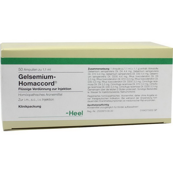 Arzneilich wirksame Bestandteile: Gelsemium Dil. D4, Gelsemium Dil. D10, Gelsemium Dil. D30, Gelsemium Dil. D200 jeweils 4,4 µl; Rhus toxicodendron Dil. D5, Rhus toxicodendron Dil. D10, Rhus toxicodendron Dil. D30, Rhus toxicodendron Dil. D200, Cimicifuga Dil. D4, Cimicifuga Dil. D10, Cimicifuga Dil. D30, Cimicifuga Dil. D200 jeweils 3,3 µl. Gemeinsame Potenzierung über die letzten 2 Stufen mit Wasser für Injektionszwecke.