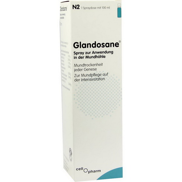 Glandosane® ist eine Spraylösung, die den mangelnden Speichel bei Mundtrockenheit ersetzt. Hierbei wird der natürliche Feuchtigkeitszustand im Mundraum regeneriert. Die Lösung wird unter anderem bei Mundtrockenheit eingesetzt, die durch eine strahlenbedingte Schädigung der Speicheldrüsen verursacht wurde.