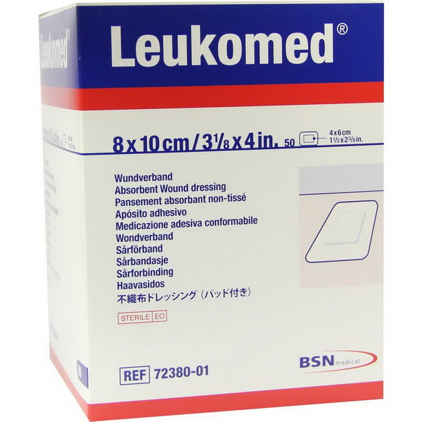 Die abgerundeten Ecken verhindern ein unerwünschtes Aufrollen des Verbandes und gewährleisten eine sichere Fixierung. Leukomed® ist trotz einer guten Sofort- und Dauerklebkraft rückstandsfrei zu entfernen. Leukomed® besteht aus einem Polyestervliesträger, beschichtet mit Polyacrylatkleber, die Wundauflage ist aus einem Viskosevlies, beschichtet mit Polypropylen. Latexfrei.