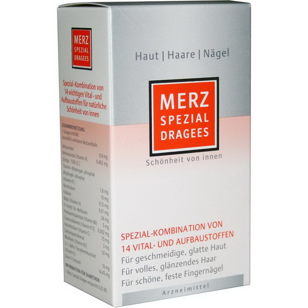 Merz Spezial Dragees wirken wie ein Schönheits-Aktivator von innen. Sie enthalten eine Spezial-Kombination von 14 Vital- und Aufbaustoffen, die die Versorgung von Haut, Haaren und Nägeln wirkungsvoll von innen unterstützen.