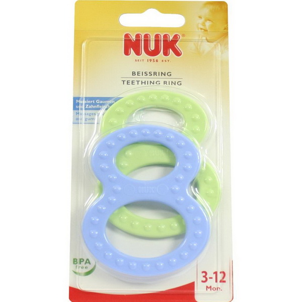Die NUK Beißringe massieren Gaumen und Zahnfleisch und mildern so den Druck im Kiefer. Das Kauen aktiviert zusätzlich den Speichelfluss und beugt Karies vor. Die genoppten Oberflächen animieren den Tastsinn und trainieren das Greifen.