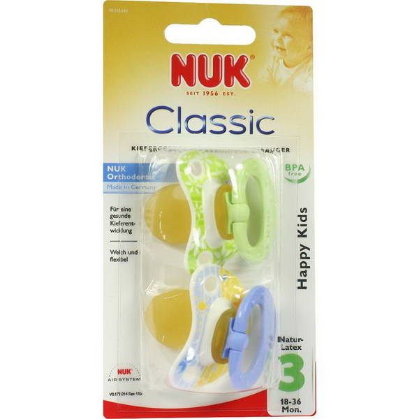 Der NUK Happy Kids Schnuller hat die kiefergerechte NUK Form, eine anatomisch geformte Mundplatte aus hochwertigem Kunststoff und ist mit klassischen Lieblingsmotiven erhältlich. Alle NUK Schnuller haben das NUK Air System. Durch ein Ventil kann die Luft aus dem Lutschteil entweichen.
