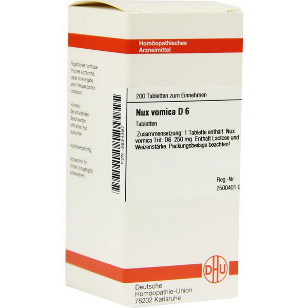 1 Tablette enthält als arzneilich wirksamen Bestandteil: Nux Vomica Trit. D6 250 mg.