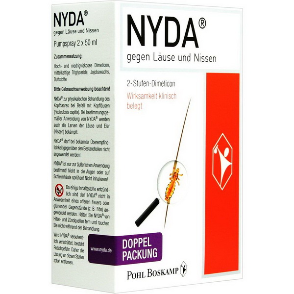 NYDA® zur physikalischen Behandlung des Kopfhaares bei Befall mit Kopfläusen (Pediculus humanus capitis). Bei bestimmungsgemäßer Anwendung von NYDA® werden sowohl die erwachsenen Läuse als auch die Jugendstadien (Larven) und Eier (Nissen) der Kopflaus bekämpft.