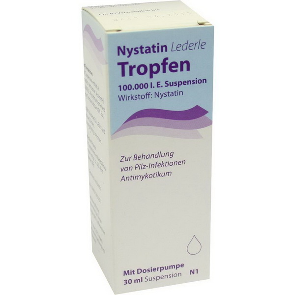 Nystatin Lederle wird bei Infektionen durch Hefepilze im Magen-Darm-Bereich und im Mund eingesetzt. Die Suspension enthält den Wirkstoff Nystatin. Das Nystatin vernichtet zuverlässig krankmachende Hefepilze und beeinträchtigt dabei nicht die natürliche Mund- und Darmflora. Der Wirkstoff lagert sich in der Zellmembran an und beeinträchtigt so die Integrität der Zellmembran, wodurch Poren in der Zellwand entstehen. Die Nystatin Lederle Suspension lindert Symptome wie weißliche Beläge im Mund, kleine Risse und Wunden in den Mundwinkeln, Halsschmerzen, Hustenreiz und Schluckbeschwerden.