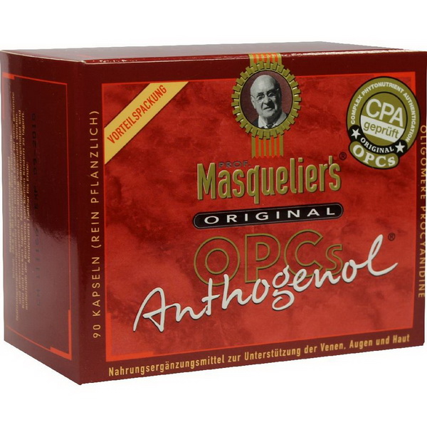 ANTHOGENOL® kombiniert zwei authentische MASQUELIER’s® Produkte. In der empfohlenen Dosierung enthält ANTHOGENOL® 75 (bei 2 Kapseln) bis 150 (bei 4 Kapseln) Milligramm MASQUELIER’s® Original OPCs (einfache und oligomere Flavanole und Polyphenole isoliert aus den Kernen von Vitis vinifera) sowie 25 (bei 2 Kapseln) bis 50 (bei 4 Kapseln) Milligramm MASQUELIER’s® French Pine Bark Complex (pflanzlicher Extrakt aus der Rinde der Pinus maritima).