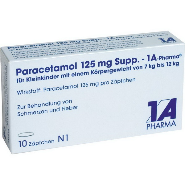 Anwendungsgebiete: symptomatische Behandlung von leichten bis mäßig starken Schmerzen, Fieber. Hinweis: Paracetamol 125 mg Supp. -1A-Pharma® sollen längere Zeit oder in höheren Dosen nicht ohne Befragen des Arztes oder Zahnarztes angewendet werden. Enthält Sojalecithin.