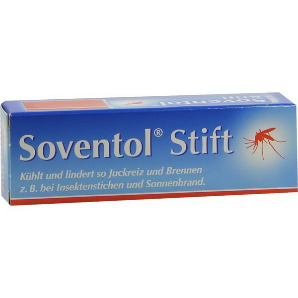 Soventol® Stift wird aufgrund des kühlenden Effektes zur lokalen Linderung von Juckreiz und Brennen, z. B. bei Insektenstichen und Sonnenbrand, angewendet.