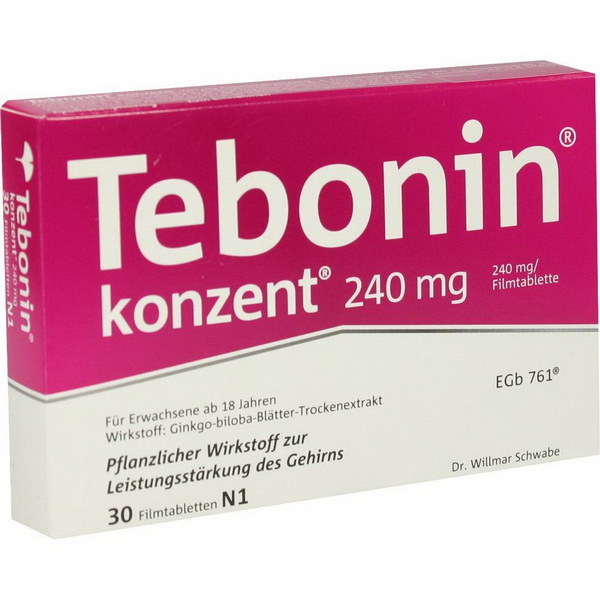 Tebonin® konzent® 240mg enthält einen Extrakt aus Ginkgo-Blättern. Tebonin® konzent® 240mg wird angewendet als pflanzliches Arzneimittel zur Besserung von (alters-assoziierten) geistigen Leistungseinbußen und zur Verbesserung der Lebensqualität bei leichter Demenz.