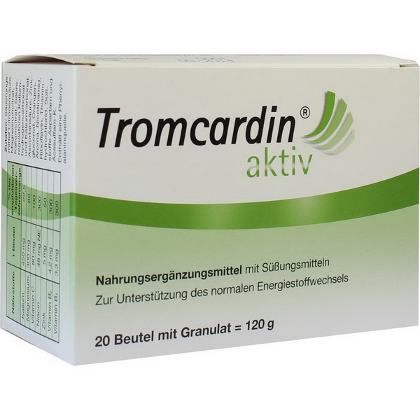 Tromcardin® aktiv ist ein Nahrungsergänzungsmittel mit Süßungsmitteln. Zur Unterstützung des normalen Energiestoffwechsels. Magnesium, Vitamine B1, B2, C und Niacin unterstützen den normalen Energiestoffwechsel; zusammen mit Kalium tragen sie zu einer normalen Funktion des Nervensystems bei. Darüber hinaus unterstützt Zink den normalen Kohlenhydratstoffwechsel, Kalium und Magnesium tragen zu einer normalen Muskelfunktion bei. Die normale Funktion des Immunsystems wird durch Zink und Vitamin C unterstützt.