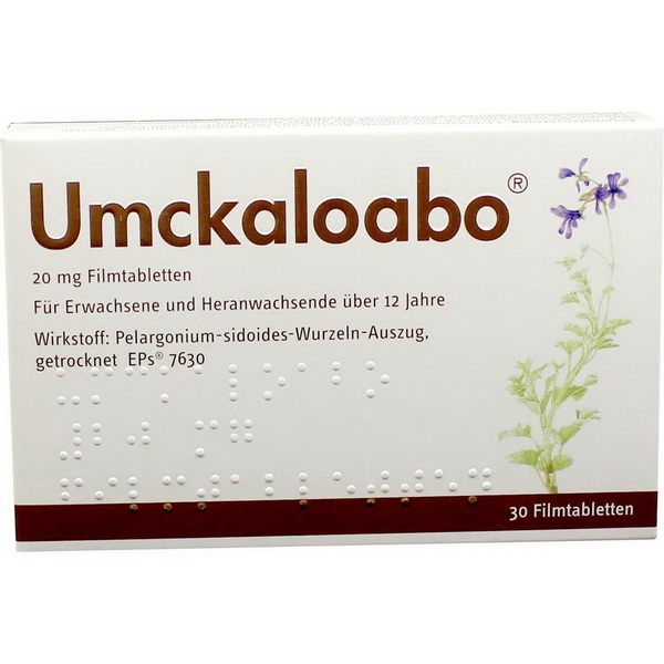 UMCKALOABO® 20 mg Filmtabletten. Für Erwachsene und Heranwachsende über 12 Jahre. Wirkstoff: Pelargonium-sidoides-Wurzeln-Auszug, getrocknet. Anwendungsgebiete: Zur symptomatischen Behandlung der akuten Bronchitis (Entzündung der Bronchien). Zu Risiken und Nebenwirkungen lesen Sie die Packungsbeilage und fragen Sie Ihren Arzt oder Apotheker. ISO-Arzneimittel – Ettlingen.