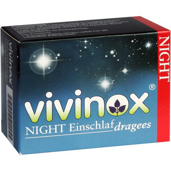 Allgemeine Informationen zu vivinox® Night EinschlafdrageesIdeal für Menschen, die bei Einschlafstörungen ein zuverlässiges pflanzliches Präparat bevorzugen. vivinox® Night Einschlafdragees vereinen die positiven Eigenschaften von Baldrian und Hopfen. Mit ihrer hohen Konzentration an Wirkstoffen fördern sie die Entspannung am Abend und den natürlichen, erholsamen und tiefen Schlaf. Sie sind gut verträglich, zur Kuranwendung geeignet und es besteht kein Gewöhnungseffekt.