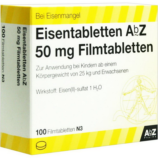 Eisentabletten AbZ 50 mg Filmtabletten Eisentabletten AbZ 100 mg Filmtabletten Wirkstoff: Eisen (II)-sulfat-1 H2O Anwendungsgebiete: Behandlung von Eisenmangelzuständen. Warnhinweis: Filmtabl. enthalten Lactose und Sucrose! Zu Risiken und Nebenwirkungen lesen Sie die Packungsbeilage und fragen Sie Ihren Arzt oder Apotheker. Stand: 10/12.