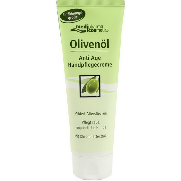 Olivenöl Anti Age Handpflegecreme mit kaltgepresstem Olivenöl und wertvollem Olivenblatt- und Olivenfruchtextrakt schützt und pflegt raue, empfindliche Hände. Die im Olivenblatt- und Olivenfruchtextrakt enthaltenen Wirkstoffe können lichtbedingte Altersflecken mildern
