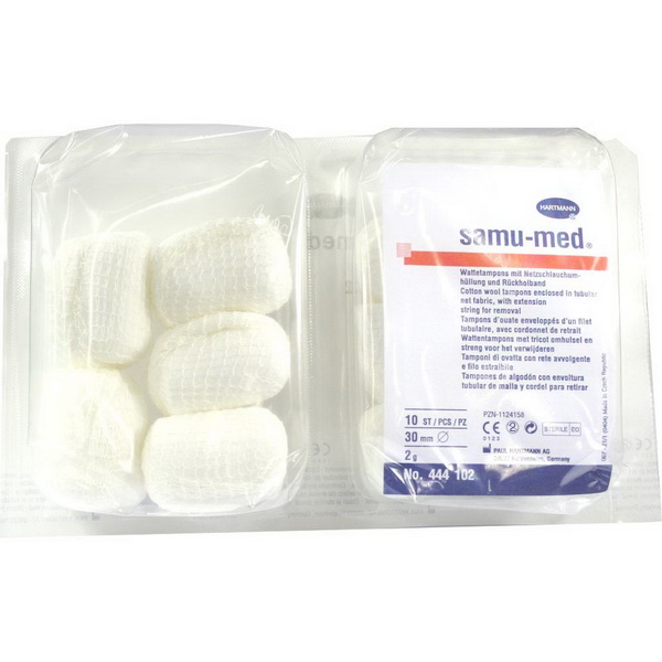 Wattetampons aus hochwertiger Verbandwatte mit weicher Netzschlauchumhüllung und schnurförmiger Verlängerung des Netzschlauches; schnelles Absorptionsvermögen und zuverlässige Speicherkapazität; lassen sich durch die zugkräftige Netzschlauchverlängerung leicht und sicher aus der tamponierten Körperhöhle wieder entfernen.