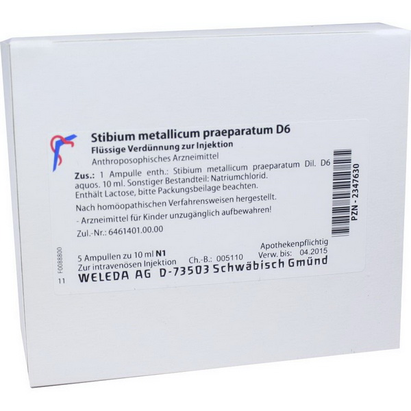 1 Ampulle enthält: Wirkstoff: Stibium metallicum praeparatum Dil. D6 aquos. 10 ml.
