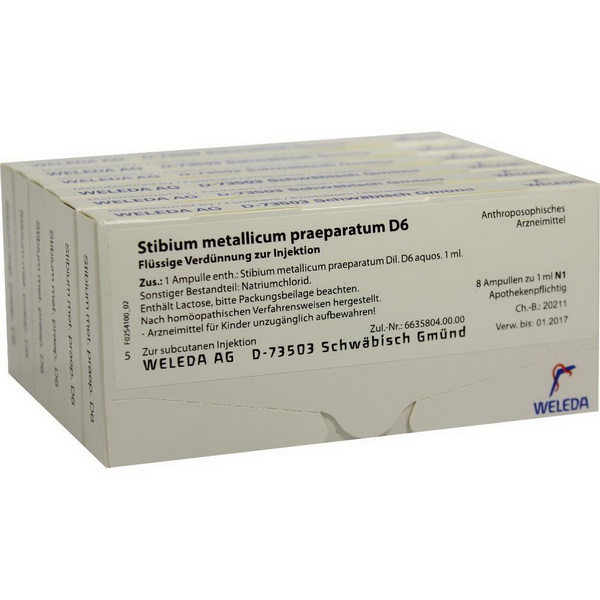 1 Ampulle enthält: Wirkstoff: Stibium metallicum praeparatum Dil. D6 aquos. 1 ml.
