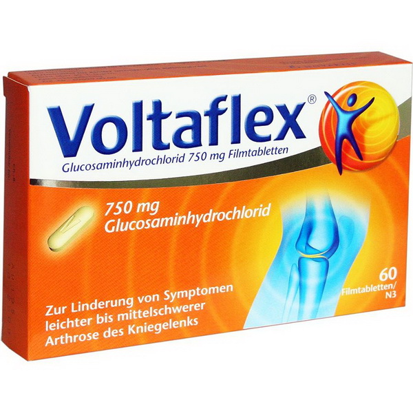 Voltaflex® Glucosaminhydrochlorid 750 mg Filmtablette (Wirkstoff: Glucosaminhydrochlorid). Zur Linderung von Symptomen leichter bis mittelschwerer Arthrose (Degeneration) des Kniegelenks. Enthält Gelborange S, Aluminiumsalz (E110) und entölte Phospholipide aus Sojabohnen. Es darf nicht eingenommen werden, wenn Sie allergisch gegenüber Schalentieren, Erdnuss oder Soja sind. Bitte beachten Sie die Packungsbeilage. Zu Risiken und Nebenwirkungen lesen Sie die Packungsbeilage und fragen Sie Ihren Arzt oder Apotheker. Rezeptfrei in Ihrer Apotheke. Referenz: VOX1-E01